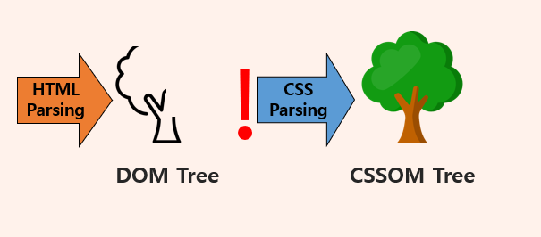 HTML을 파싱하면서 DOM Tree를 구성합니다. HTML을 파싱하는 도중에 CSS를 만나서 CSS Parsing이 진행됩니다. 잠깐! 렌더 트리를 구성하기 위해선 DOM트리와 CSSOM트리가 필요합니다. DOM트리는 파싱 중에 순차적으로 구성할 수 있지만 CSSOM트리는 CSS를 모두 해석해야 구성할 수 있습니다. 즉, CSSOM 트리가 구성되지 않으면 렌더링이 차단됩니다.