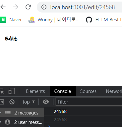 url에 임의로 id 값을 주면 console에 해당 url의 id 값을 받아온다. 이로써 정상적으로 작동한다는 것을 알 수 있다.