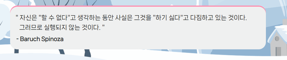 Banner에서 감명 깊었던 명언들을 자동 슬라이드 시킬 예정이라 네비게이션, 이전, 다음 버튼은 따로 구현하지 않는다. 추후에 요일에 따라 다른 명언들이 슬라이드 되도록 기능을 추가하면 재밌을 것 같다.