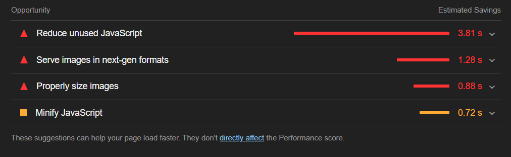 사용하지 않는 JS를 줄이라고 한다. 사진 아래 내용을 확인해보면, 이 제안들은 page load을 빠르게 하는데에 도움을 줄 수 있지만 성능 점수에 직접적인 영향을 주지는 않는다고 한다. 일단 개선이 필요한 부분이기에 시도해보자.