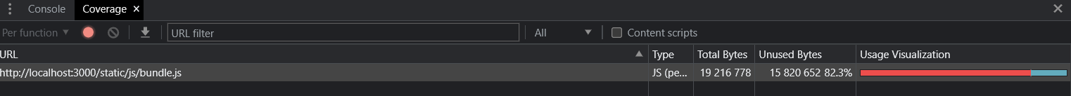 Chrome DevTools의 Coverage 탭은 사용하지 않는 JavaScript 및 CSS 코드를 찾는 데 도움이 될 수 있다. Usage visualization(사용시각화) 탭의 빨간색 부분이 사용하지않는 js코드이다. 참고로 알다우면 좋을 것 같다.