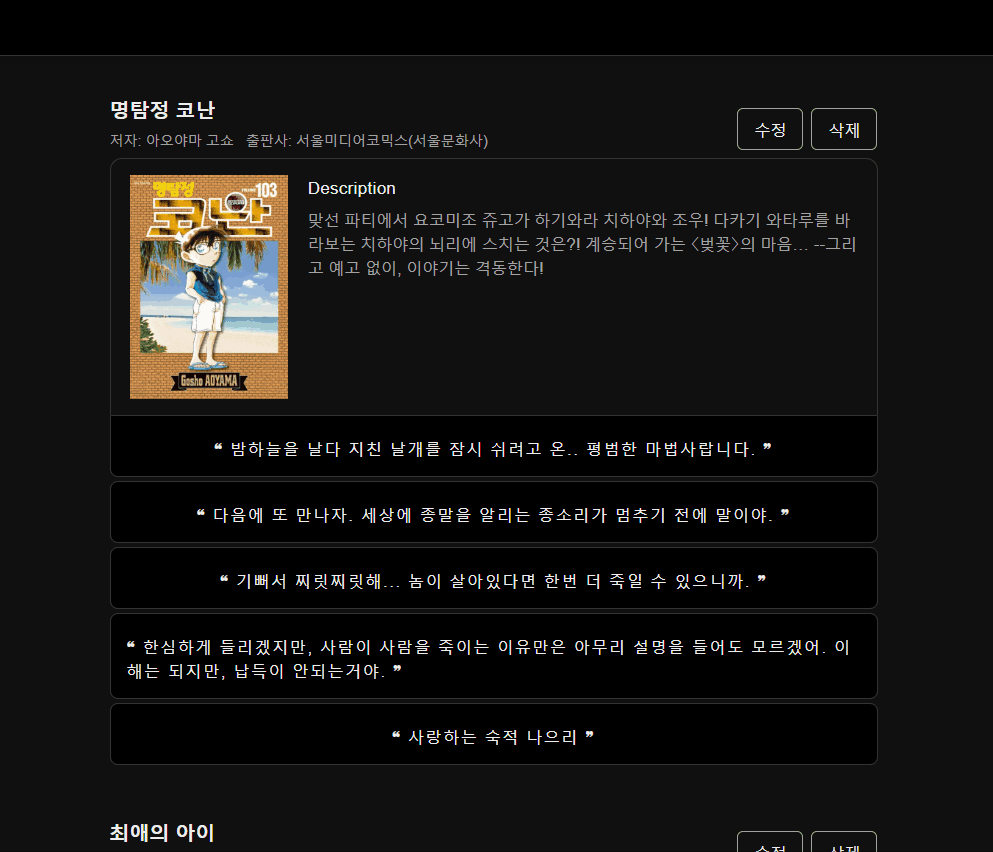 책 테이블을 업데이트 하는 것과 인용문 테이블을 업데이트 하는 것을 별도로 진행해줘야 할 것 같다.