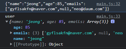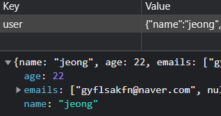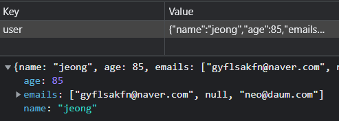 실제로 저장된 것은 JSON형태의 문자 데이터 이지만 브라우저가 분석하여 보기 좋은 js 데이터로 출력해주는 것을 볼 수 있다.
